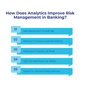 Analytics helps banks spot risk patterns early by analyzing transaction and customer data. It provides clearer visibility into potential financial exposure. This supports timely and informed risk decisions.
